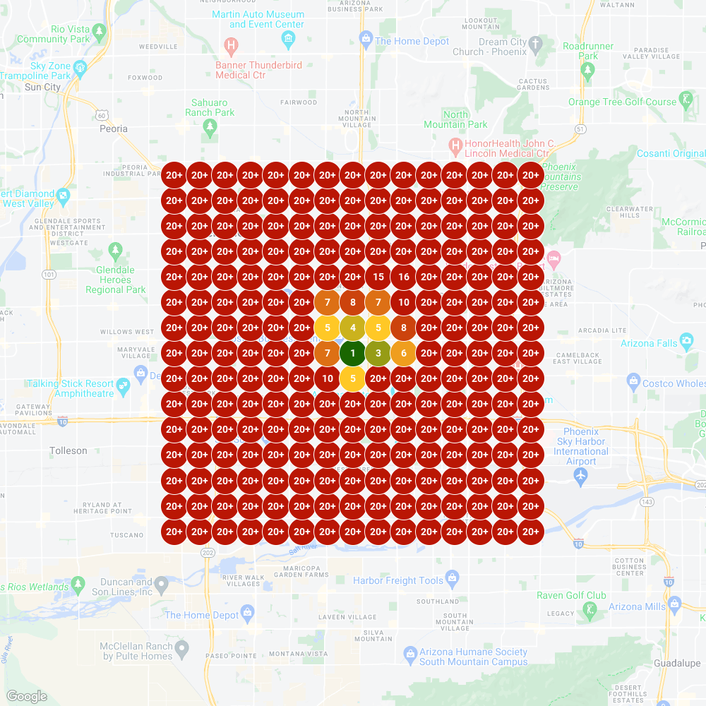These heatmaps represent ranking performance across a 15×15 geographic grid covering the broader service area. Darker red indicates #1 rankings, while lighter colors show lower positions. Each grid point represents a specific location where we measured map pack visibility.